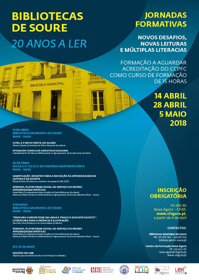 Estas jornadas formativas da Rede de Bibliotecas de Soure realizam-se nos dias 14 e 28 de abril e 5 de maio, na Biblioteca Municipal de Soure e Escola Martinho Árias. Procura-se dar resposta a um dos maiores desafios das bibliotecas – a articulação curricular, o trabalho colaborativo e o ensino contextualizado de competências digitais, de informação e mediáticas.