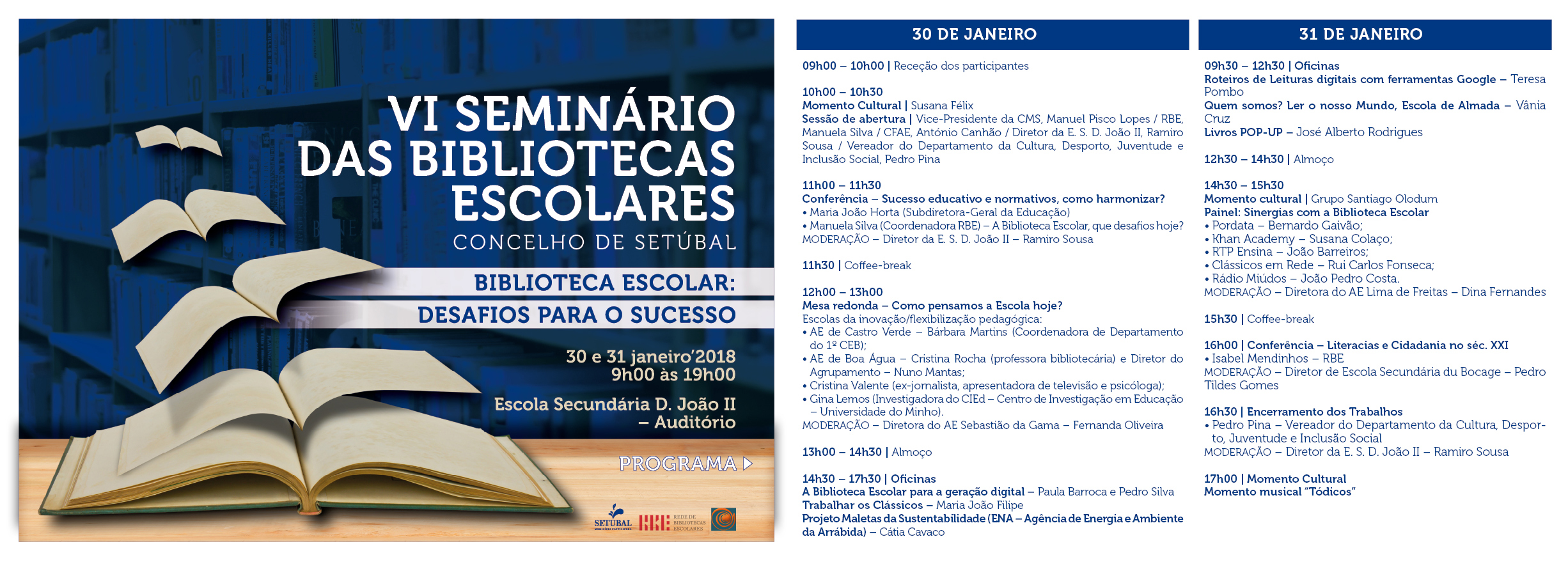 O grupo de trabalho das bibliotecas escolares do concelho de Setúbal, em colaboração com a Câmara Municipal de Setúbal e a Rede de Bibliotecas Escolares, organiza nos dias 30 e 31 de janeiro o VI Seminário das Bibliotecas Escolares do Concelho de Setúbal.