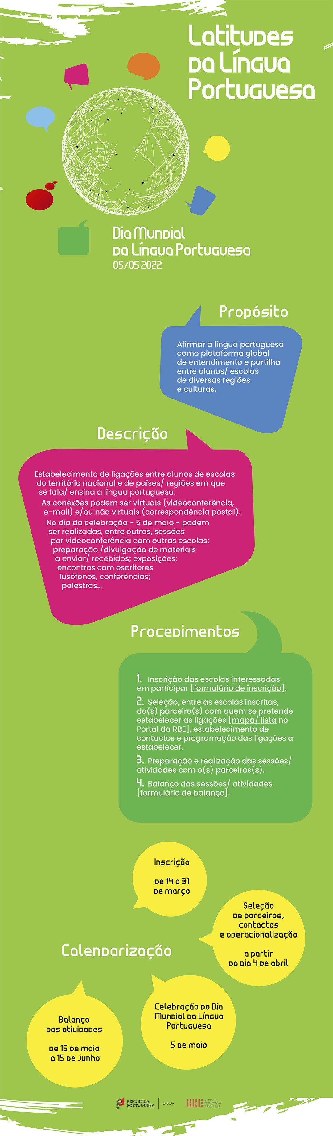 No dia da celebração - 5 de maio - podem ser realizadas, entre outras, sessões por videoconferência com outras escolas; preparação /divulgação de materiais a enviar/ recebidos; exposições; encontros com escritores lusófonos, conferências; palestras…