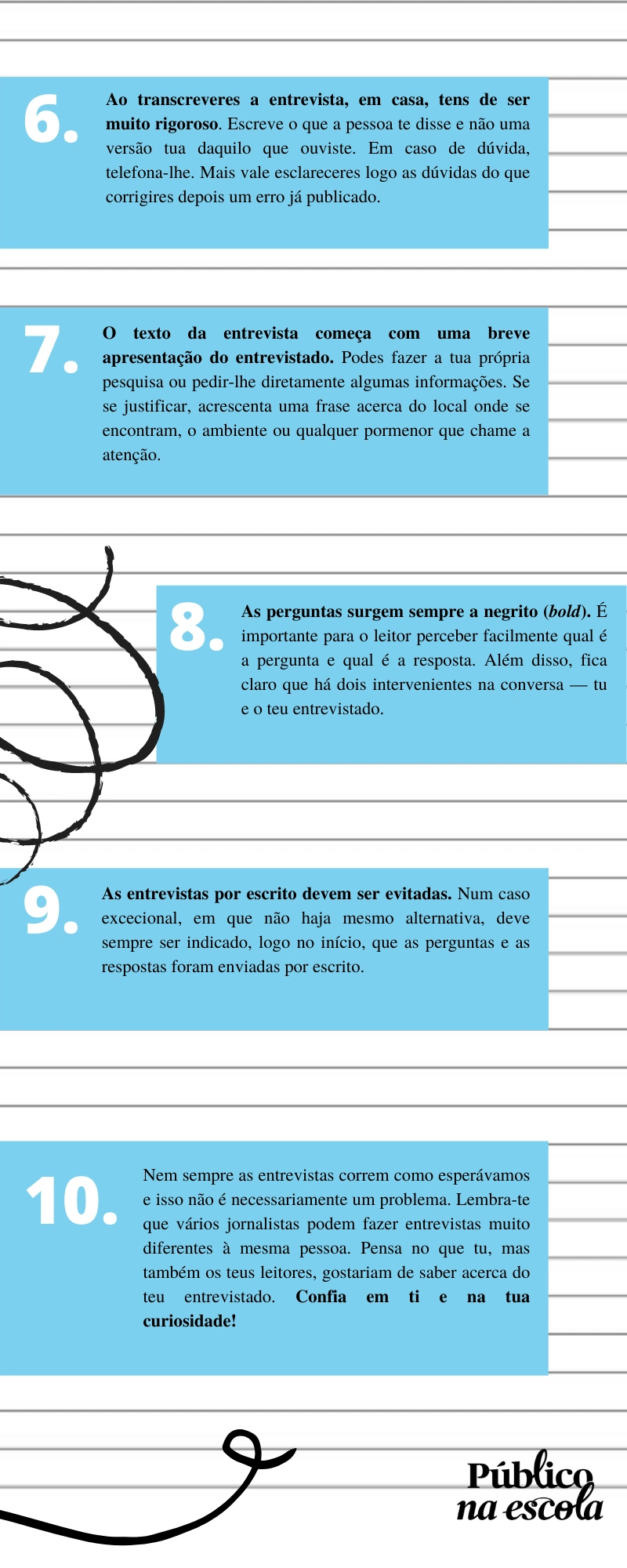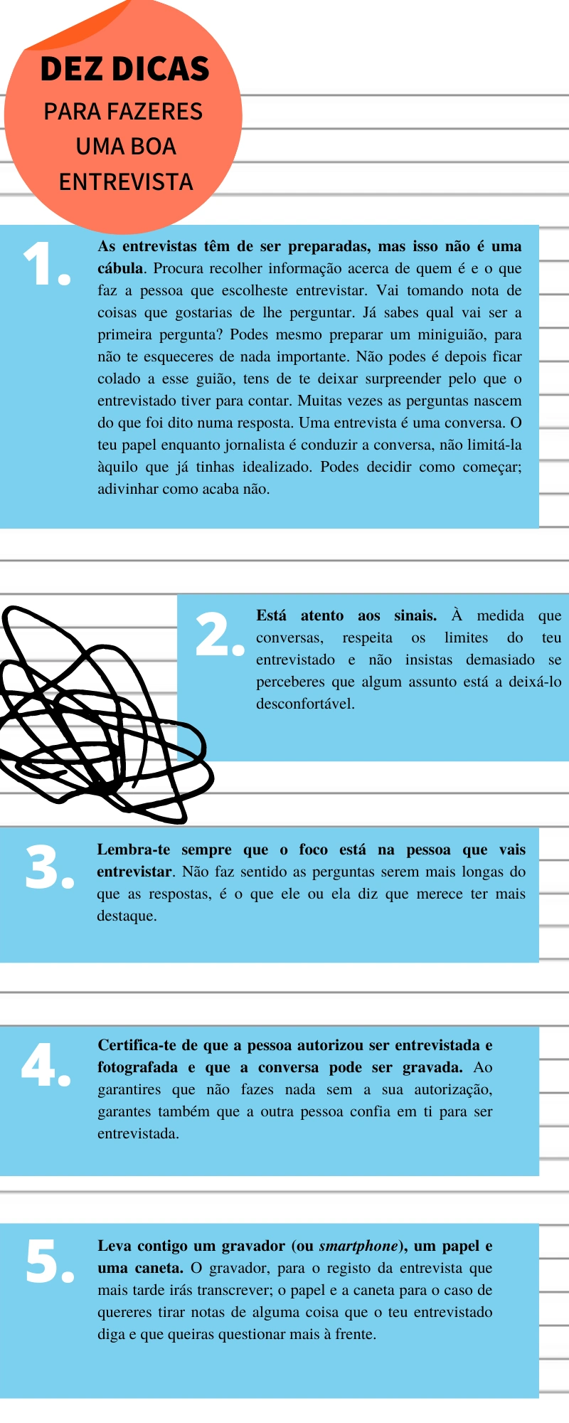 É importante que consultes as regras de participação neste concurso promovido pelo PÚBLICO na Escola e a Rede de Bibliotecas Escolares. Para que nada falhe no momento de preparares e fazeres a entrevista, reunimos dez pontos essenciais que podem ajudar-te a captar o melhor do teu entrevistado.