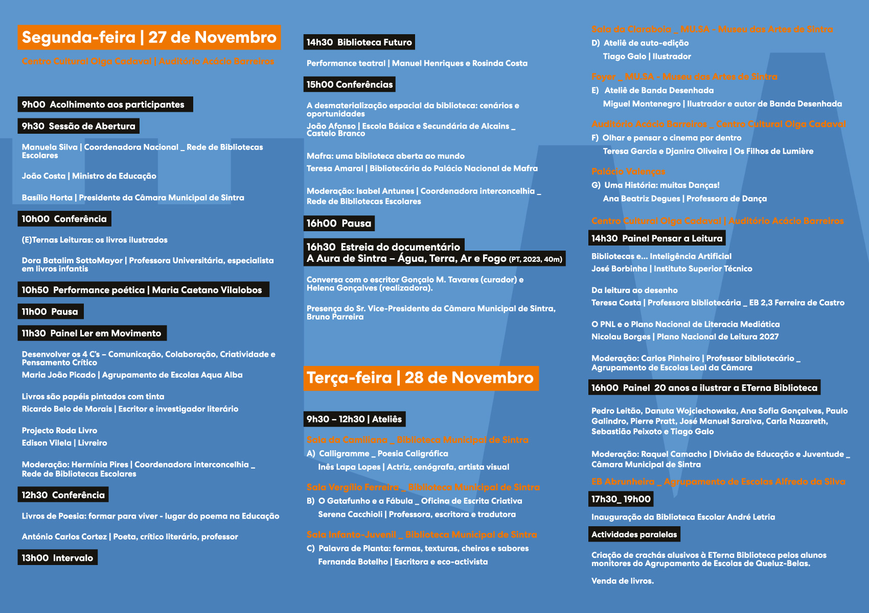 A Divisão de Educação e Juventude da Câmara Municipal de Sintra vai promover, nos dias 27 e 28 de novembro de 2023, no Centro Cultural Olga Cadaval, a ETerna Biblioteca – 20.º Encontro de Professores e Educadores do Concelho de Sintra sobre Bibliotecas Escolares.