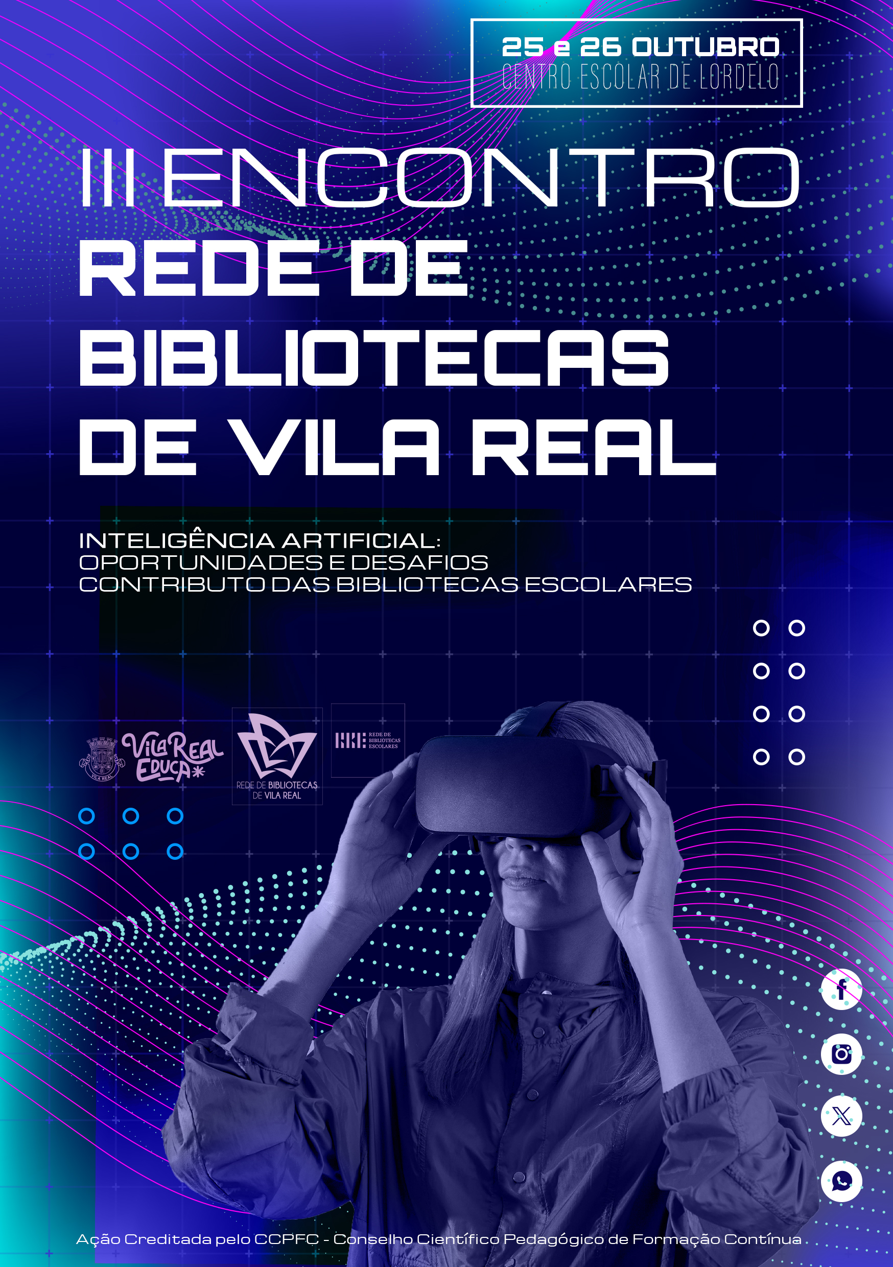 A Rede de Bibliotecas de Vila Real, em parceria com a Câmara Municipal de Vila Real, a Rede de Bibliotecas Escolares e o Centro de Formação de Vila Real, organiza o III Encontro da Rede de Bibliotecas de Vila Real, subordinado ao tema “Inteligência artificial: oportunidades e desafios - contributos das bibliotecas escolares”.