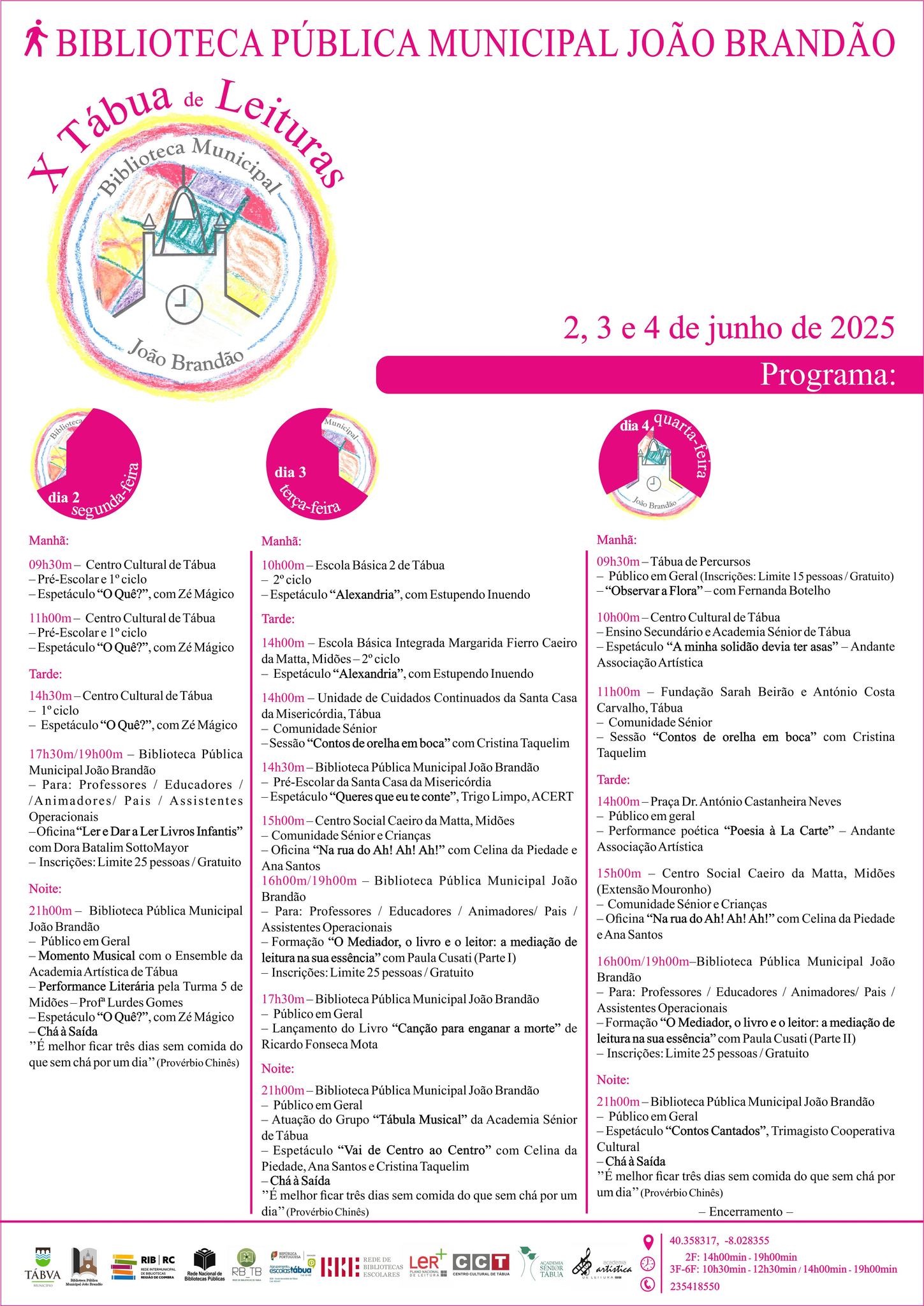 Nesta X edição do Tábua de Leituras, que decorre nos dias 2, 3 e 4 de junho de 2025, o Município de Tábua, através da Biblioteca Pública Municipal João Brandão, apresentam uma excelente programação orientada para diferentes públicos, incluindo o escolar, como tem sido seu apanágio.