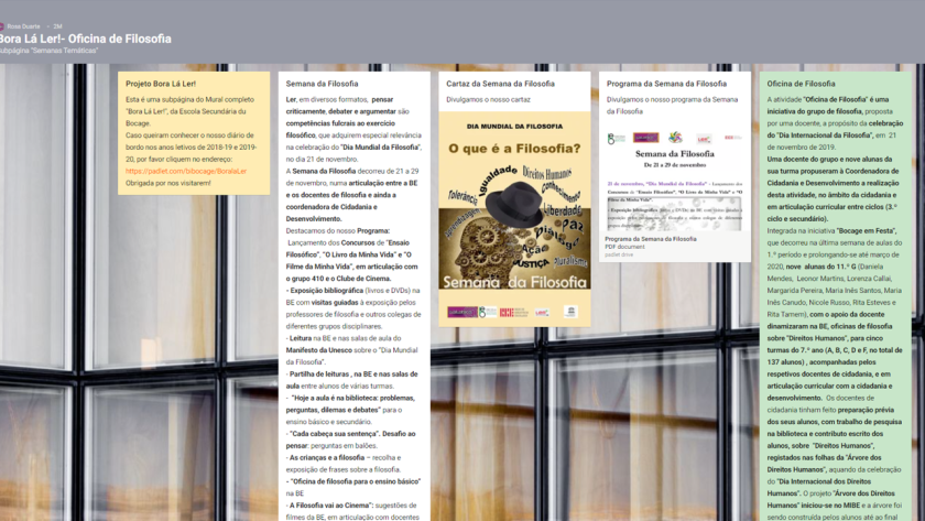 Oficina de Filosofia integrada no Dia Internacional da Filosofia para 5 turmas do 7o ano. 9 alunas do 11o G dinamizaram sessões com apoio da docente e da BE, em articulação curricular com cidadania e entre ciclos: 3.º ciclo e secundário. O tema Direitos Humanos iniciou-se no MIBE, com exposição e sugestões de leituras, pesquisa na BE e registo escrito na Árvore dos Direitos Humanos. Atividade em grupo: desafio à reflexão, debate, escrita e partilha com os pares. Iniciativa com foco no treino de competências interpares e ciclos diferentes.