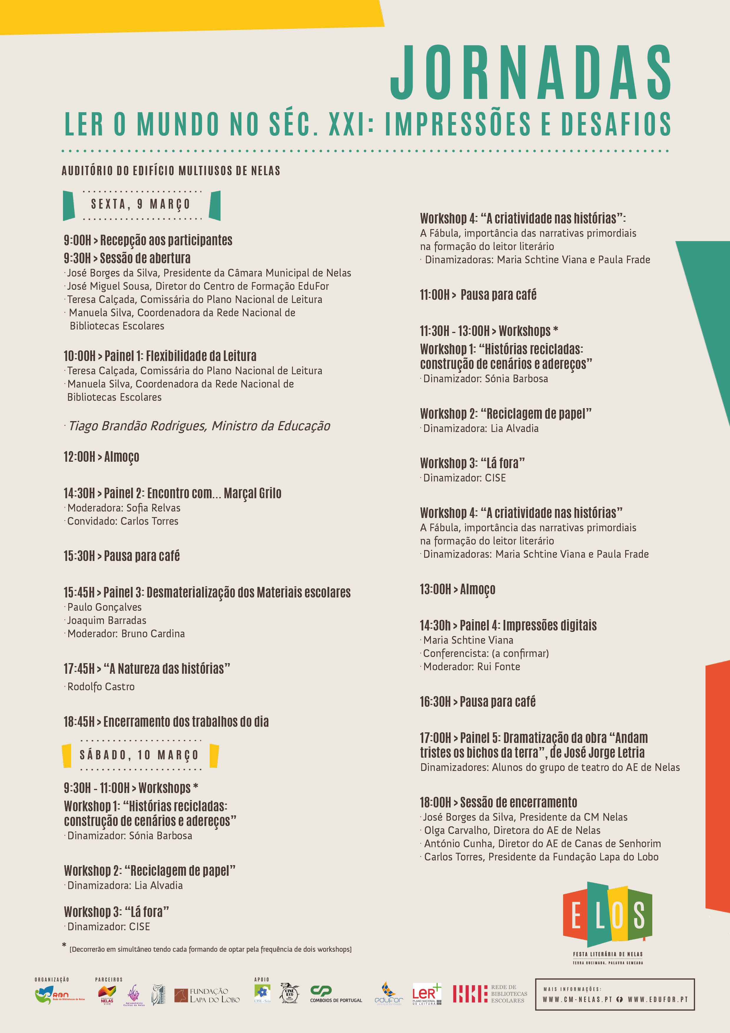 A Rede de Bibliotecas de Nelas, a Câmara Municipal de Nelas, em parceria com o Centro de Formação EduFor e os Agrupamentos de Escolas de Nelas e de Canas de Senhorim, organizam as Jornadas “Ler o Mundo no séc XXI: impressões de desafios", integradas na "ELOS - Festa Literária de Nelas", e a realizar nos dias 9 e 10 de março de 2018, no Auditório do Edifício Multiusos da Câmara Municipal de Nelas.