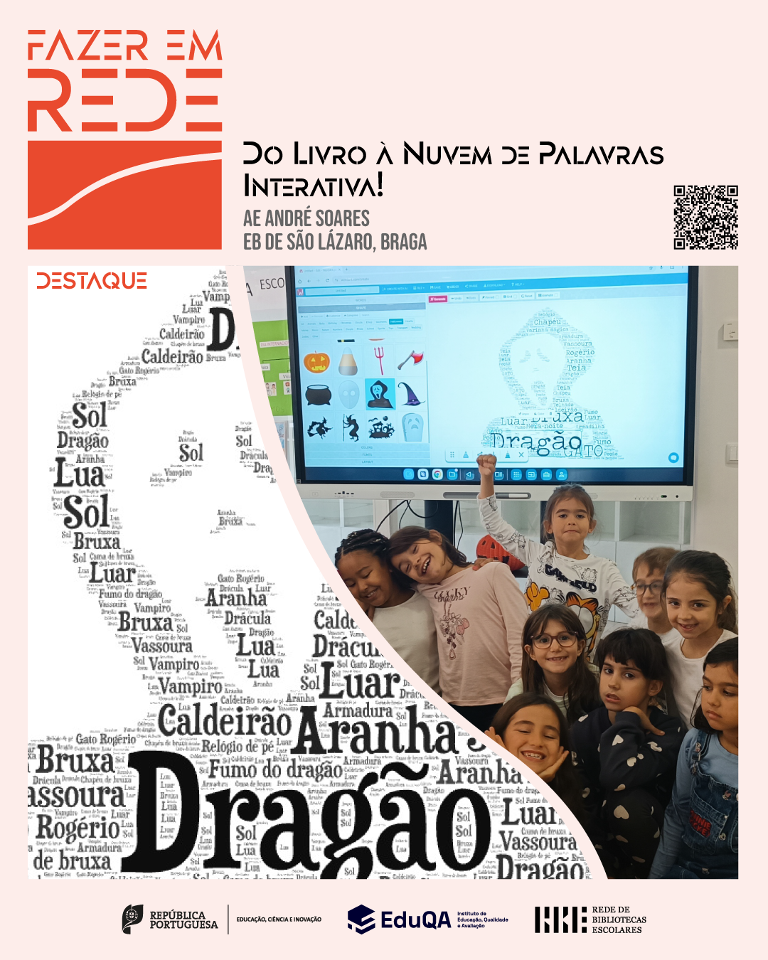 A biblioteca da Escola Básica de São Lázaro, do Agrupamento de Escolas André Soares, Braga, realizou a atividade: Do livro à nuvem de palavras interativa! em articulação com os docentes do 1.º ciclo do ensino básico.