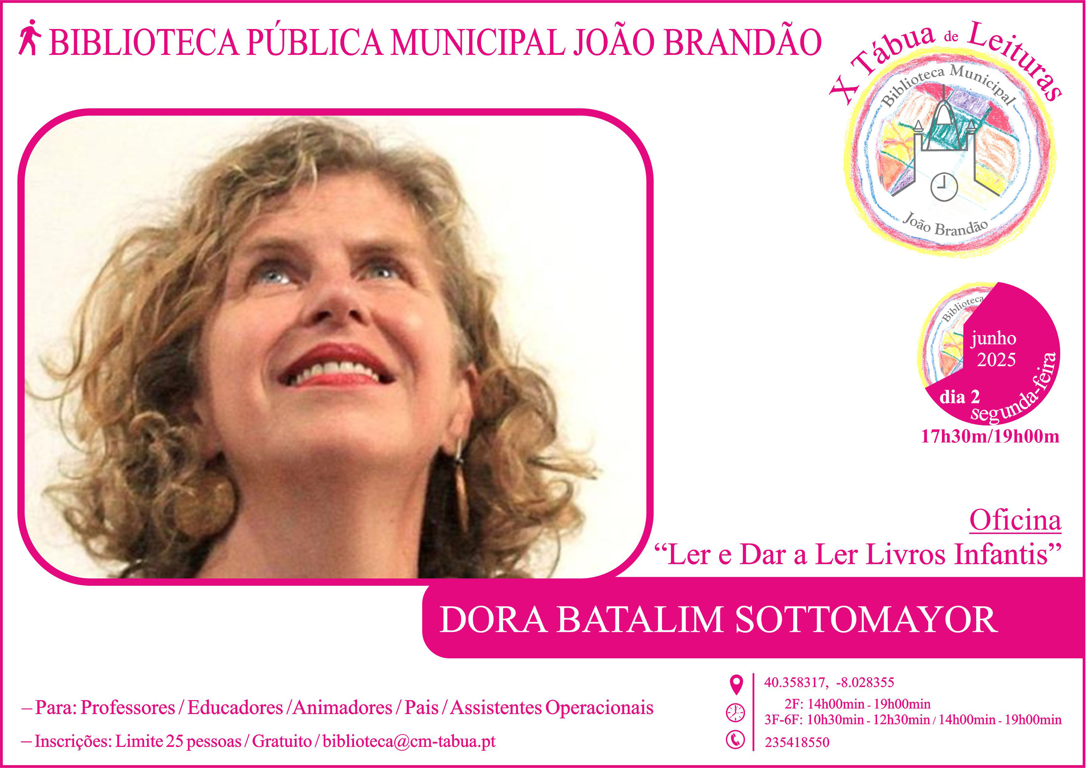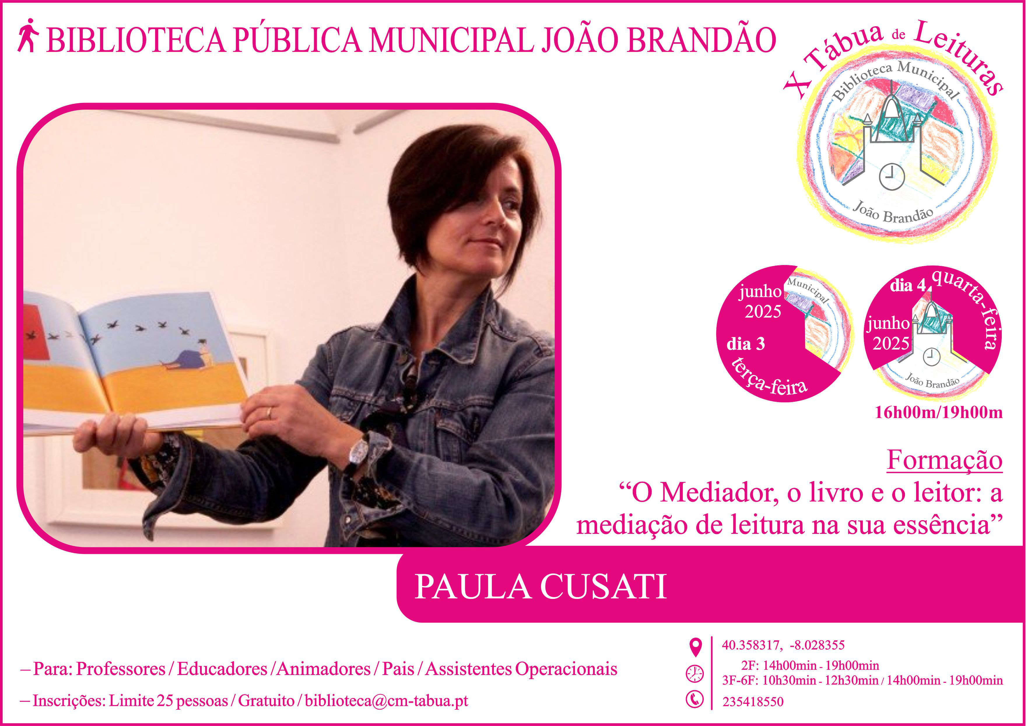 Nesta X edição do Tábua de Leituras, que decorre nos dias 2, 3 e 4 de junho de 2025, o Município de Tábua, através da Biblioteca Pública Municipal João Brandão, apresentam uma excelente programação orientada para diferentes públicos, incluindo o escolar, como tem sido seu apanágio.